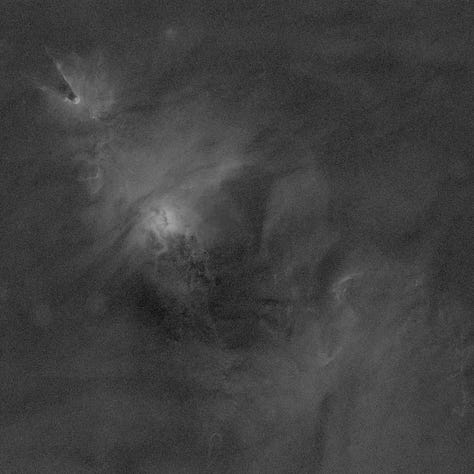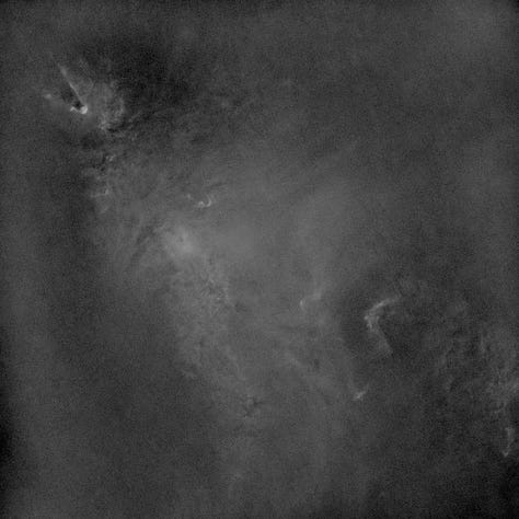 Even though these narrowband datasets are stored as RGB images (because the camera is one-shot color), it’s very useful to look at the channels separately: each extracted channel is effectively telling you how much signal the camera recorded through that filter as seen by the red/green/blue elements of the sensor.
