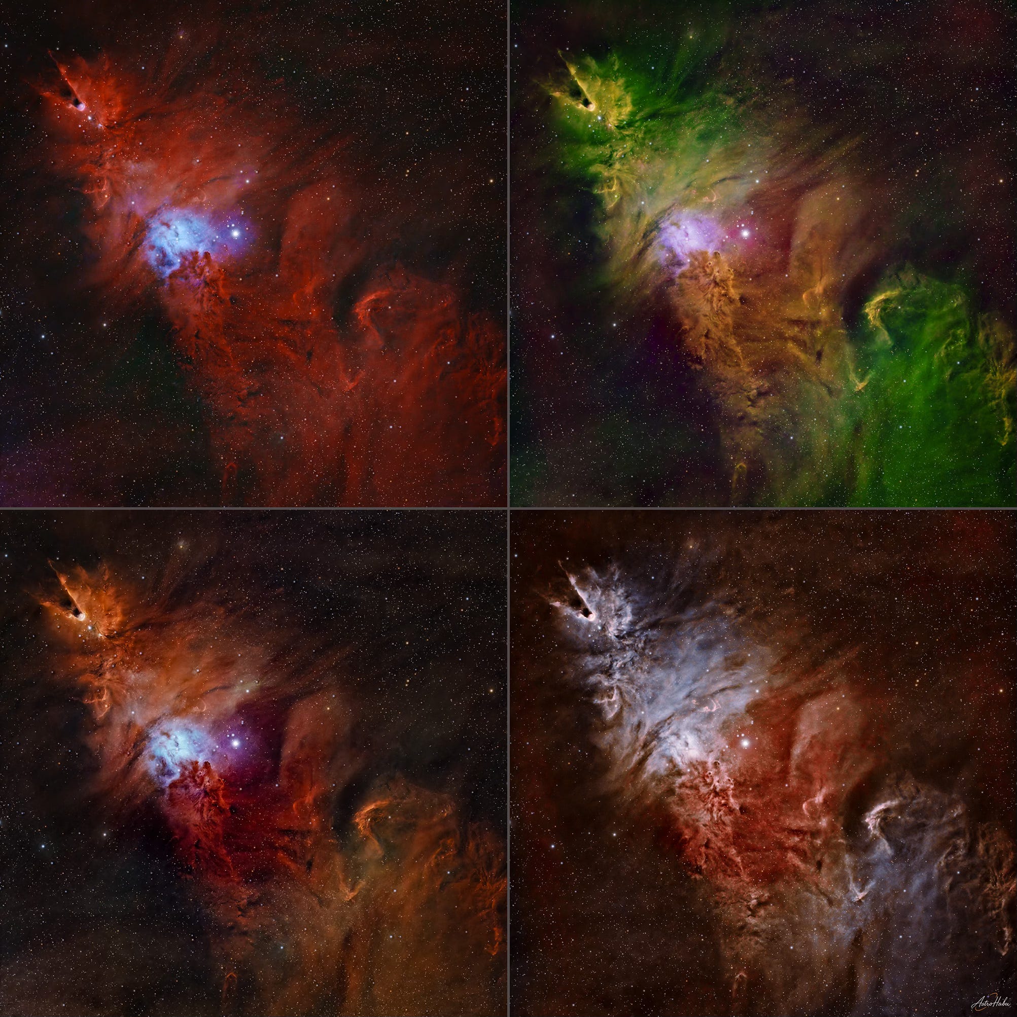 From left to right, from top to bottom: HOO, SHO, HHO and Foraxx starless images, out of PixInsight workflow.