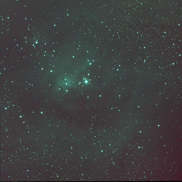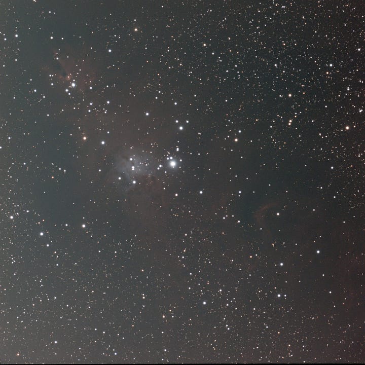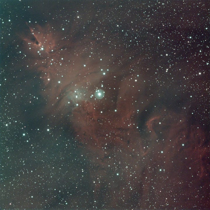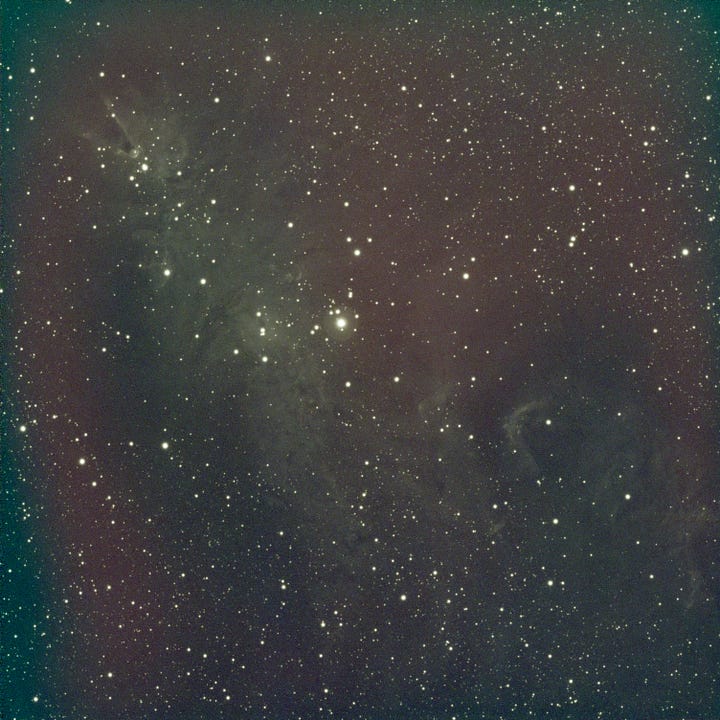 NGC 2264 is a great target for this, because it contains strong emissions from ionized hydrogen (Hɑ), doubly ionized oxygen (OIII), and ionized sulfur (SII), three of the classic channels used to build narrowband color images.