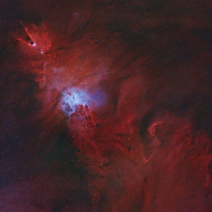 By looking at the individual channels extracted from the narrowband starless masters, you can already see quite clearly how differently the nebula behaves at each wavelength. In particular, ionized hydrogen (Hα) contributes essentially nothing in the blue channel, while doubly ionized oxygen (OIII) shows up almost entirely in the green and bluechannels.