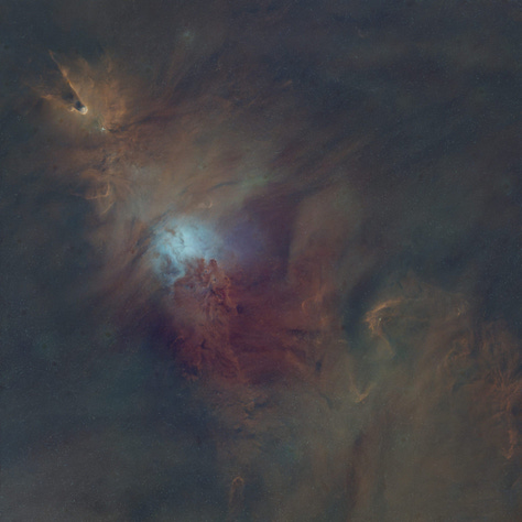 This one is essentially “Hα everywhere”, using red and green to exploit the strong hydrogen signal and build a very bright, detailed structure, with OIII providing color separation in the blue.